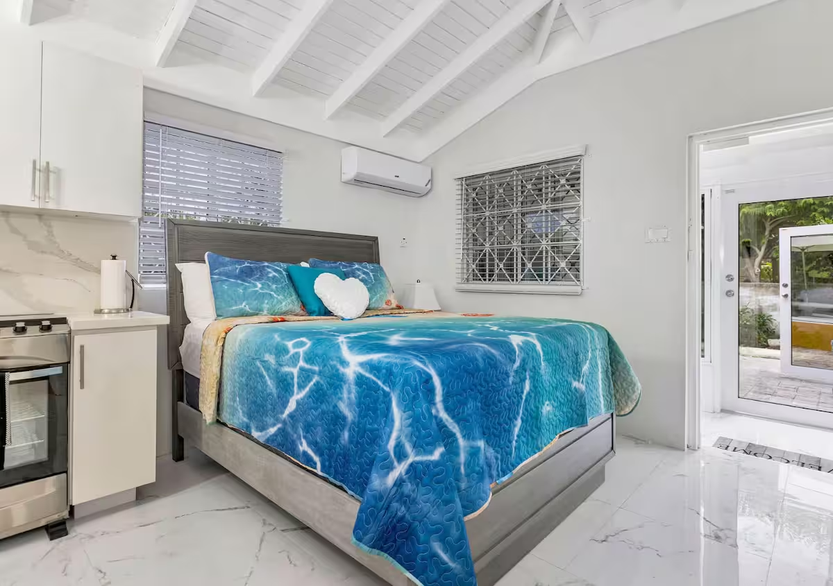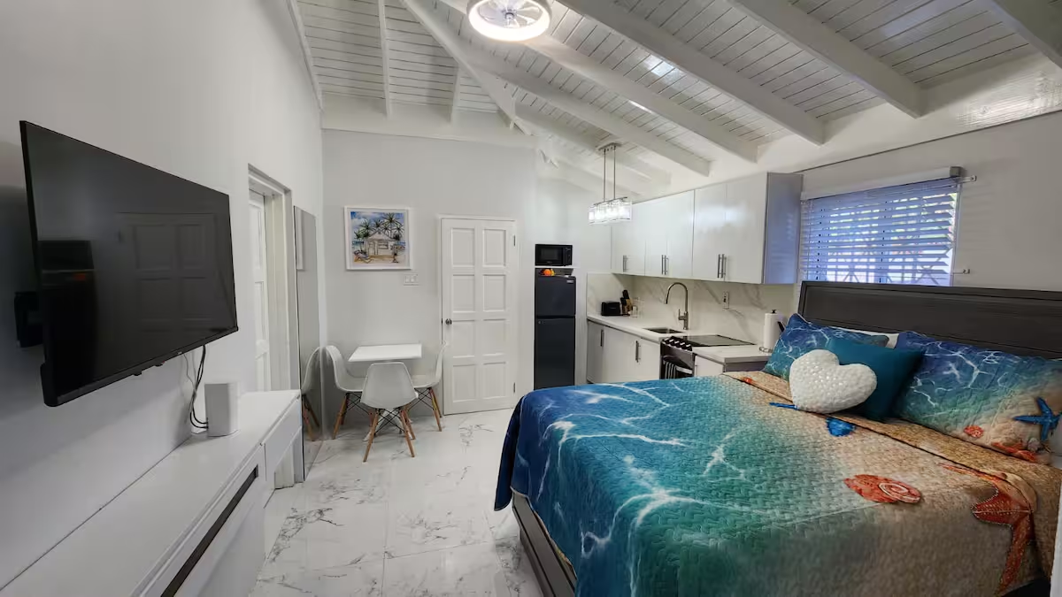 Escape to this cozy studio at the Drax Hall Estate Country Club. Perfect for couples or small families, it features air conditioning, a smart TV, free Wi-Fi, and a kitchenette. Located in a secure gated community, enjoy access to a pool, gym, beach, and more.