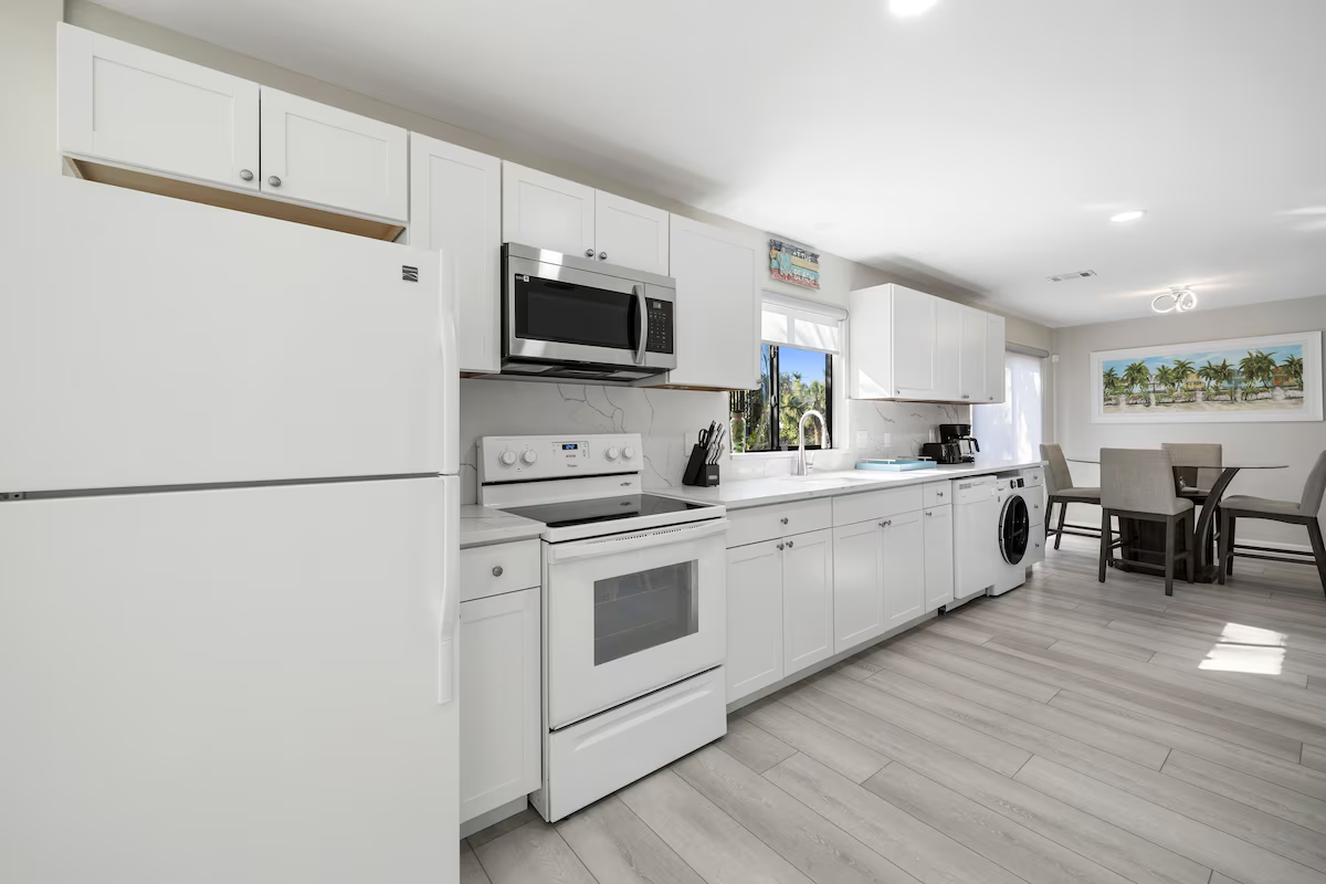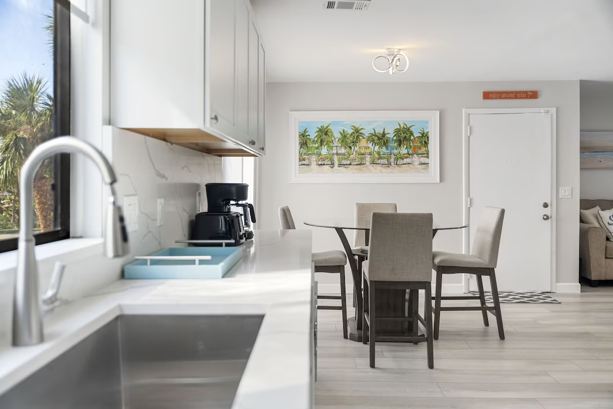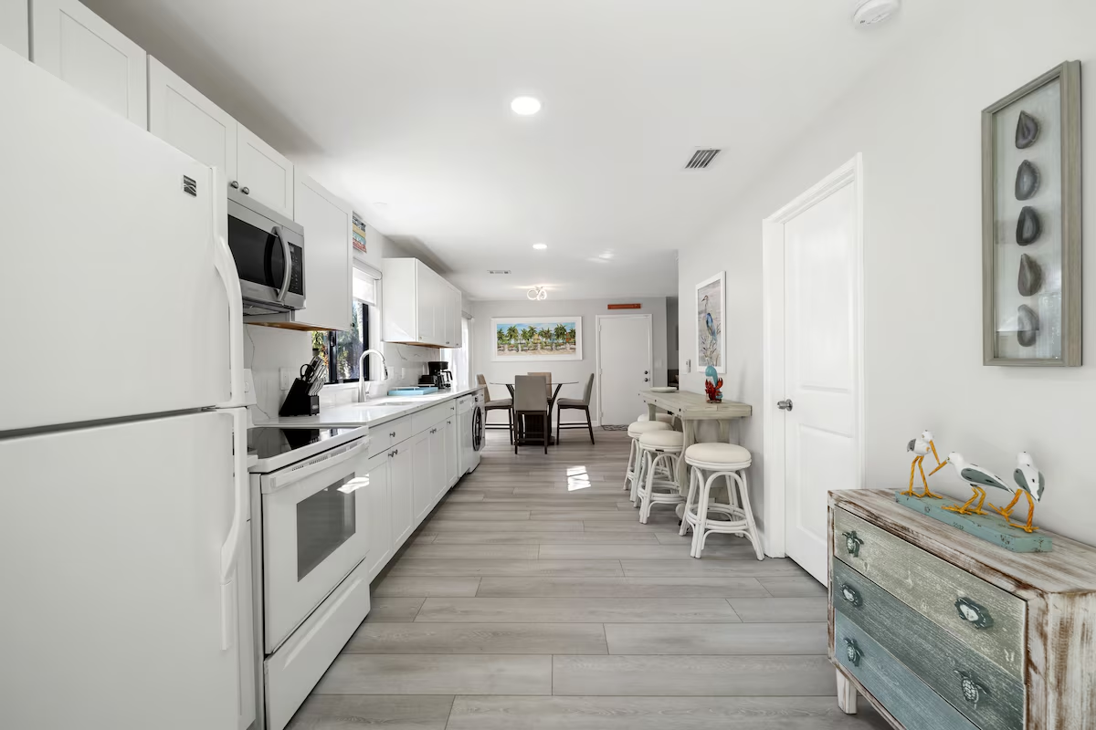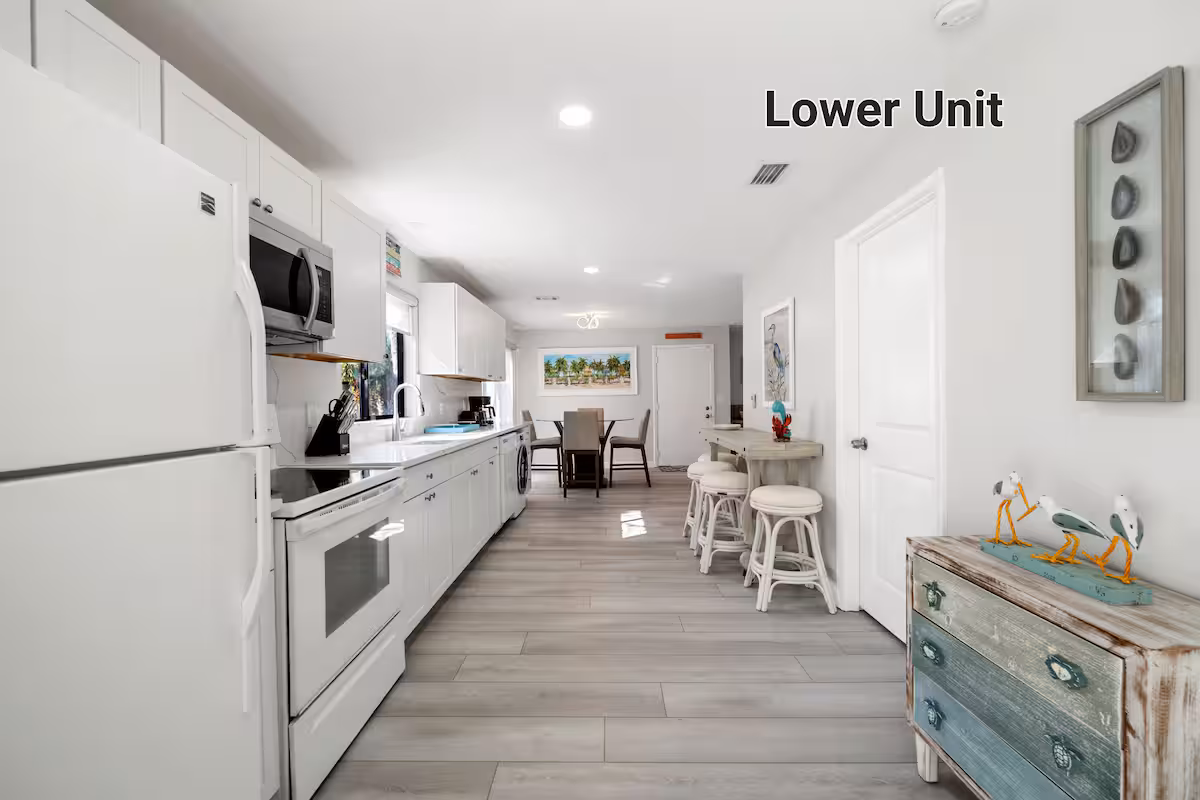 Sunset Rendezvous Beach Condo Lower Unit has been thoughtfully renovated and elegantly designed, seamlessly blending modern beach aesthetics with a touch of Old Florida flair. The kitchen features sleek stainless steel appliances and is fully stocked to meet all your culinary needs. The master suites boasts a brand-new Queen bed, ample closet space, and a dresser, offering a peaceful retreat where you can truly unwind. The second bedroom, equally inviting, each furnished with two new twin beds, a closet, and a dresser—ideal for additional guests.