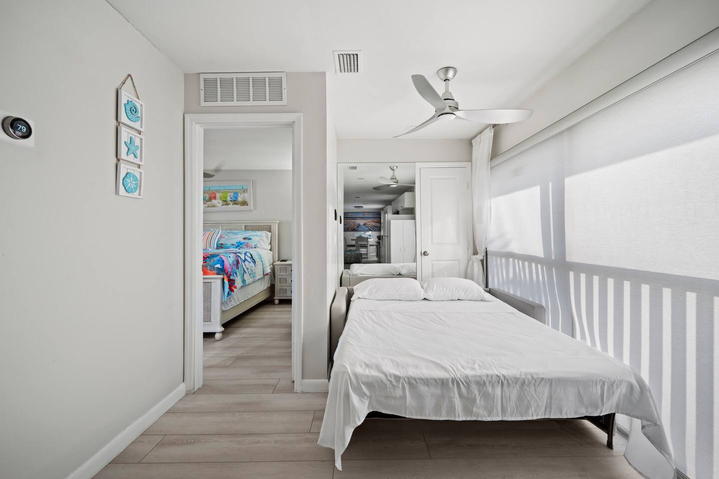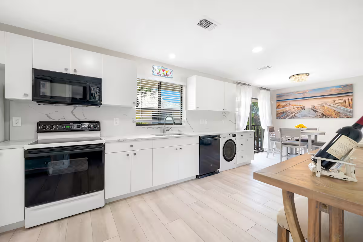 Sunset Rendezvous Beach has been thoughtfully renovated and elegantly designed, seamlessly blending modern beach aesthetics with a touch of Old Florida flair. The kitchen features sleek stainless steel appliances and is fully stocked to meet all your culinary needs. The master suites boasts a brand-new Queen bed, ample closet space, and a dresser, offering a peaceful retreat where you can truly unwind. The second bedroom, equally inviting, each furnished with two new twin beds, a closet, and a dresser—ideal for additional guests.