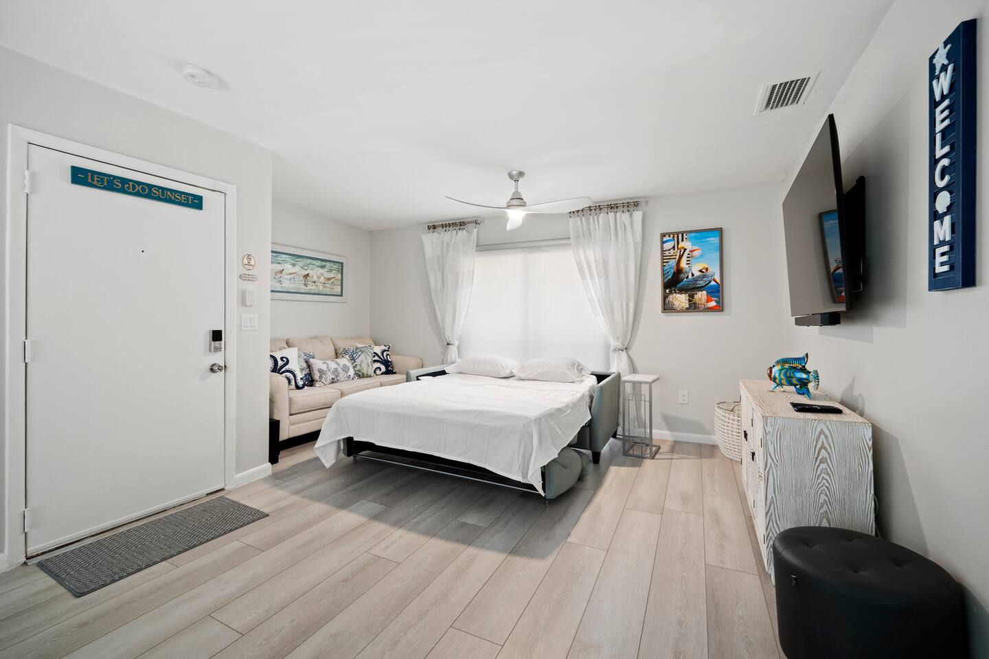 The expansive living area is bathed in natural light, thanks to large windows. Three new sofas provide ample seating, complemented by a flat-screen TV for your entertainment. The living rooms also features a pull-out couch, providing additional sleeping accommodations for four.